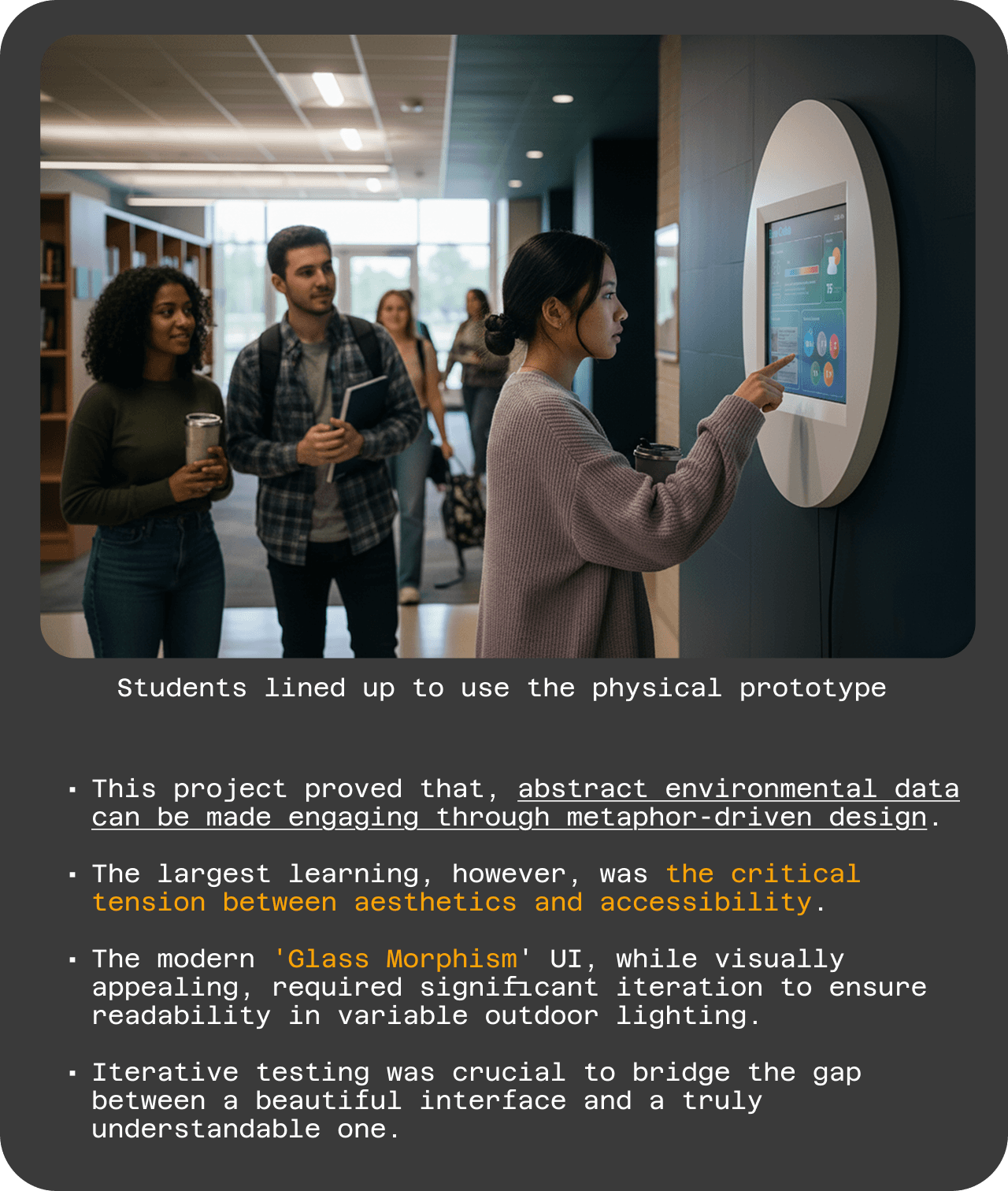 "Our initial assumption was that students wouldn't engage with environmental data. Research proved the opposite: awareness can be triggered through accessible, engaging design."